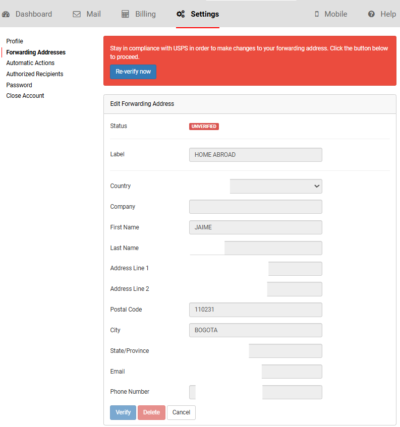 If the option to delete your forwarding address is grayed out, this likely indicates that your account requires reverification.