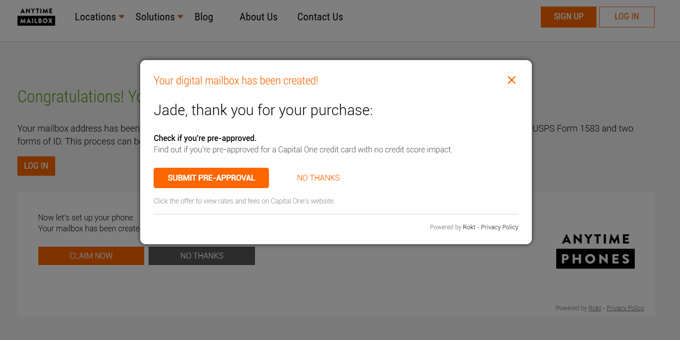 Once your payment is confirmed, a pop-up box will appear, confirming that your payment was successful and your digital mailbox has been created. You may close the pop-up by clicking the “X” button.