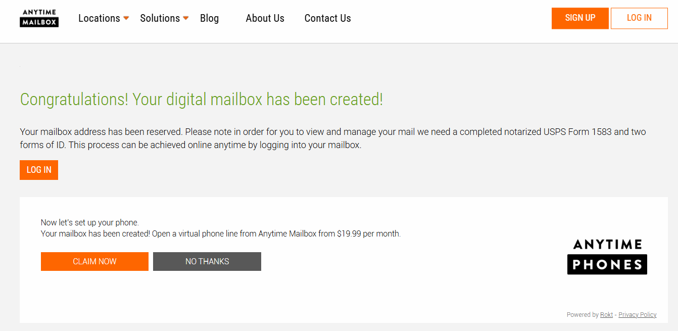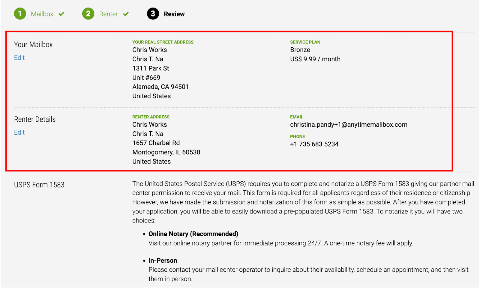 Step 5: Before finalizing your signup, review all the details you’ve entered, including your service plan and associated fees. You will also receive a reminder about the USPS Form 1583, which is required to activate your mailbox.
