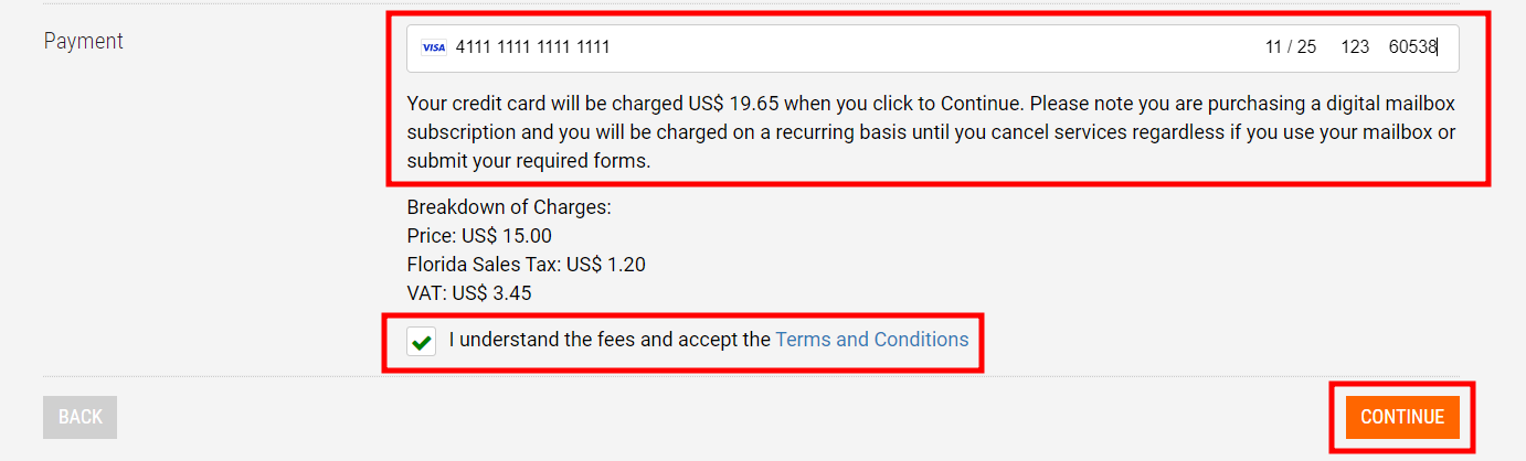 Step 6: To finish signing up, please enter your credit card information. Your subscription will automatically renew, and your card will be charged until you cancel the service. This applies even if you don't actively use the mailbox or submit the necessary forms. Select "Continue" to move forward.
