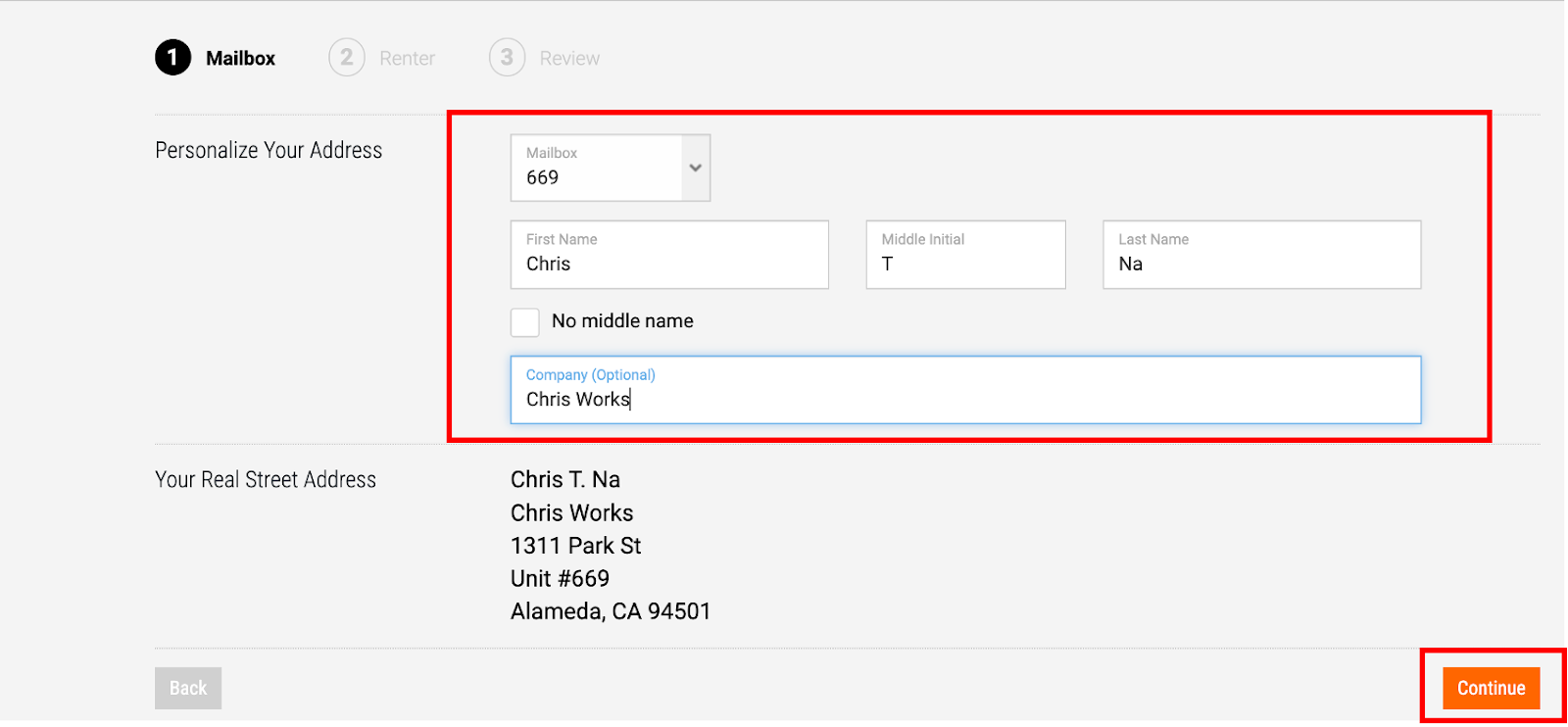 Step 3: Choose a mailbox number, enter your name and business name (if applicable). Make sure your name matches your ID, as this is required for verification purposes. Click Continue to proceed.