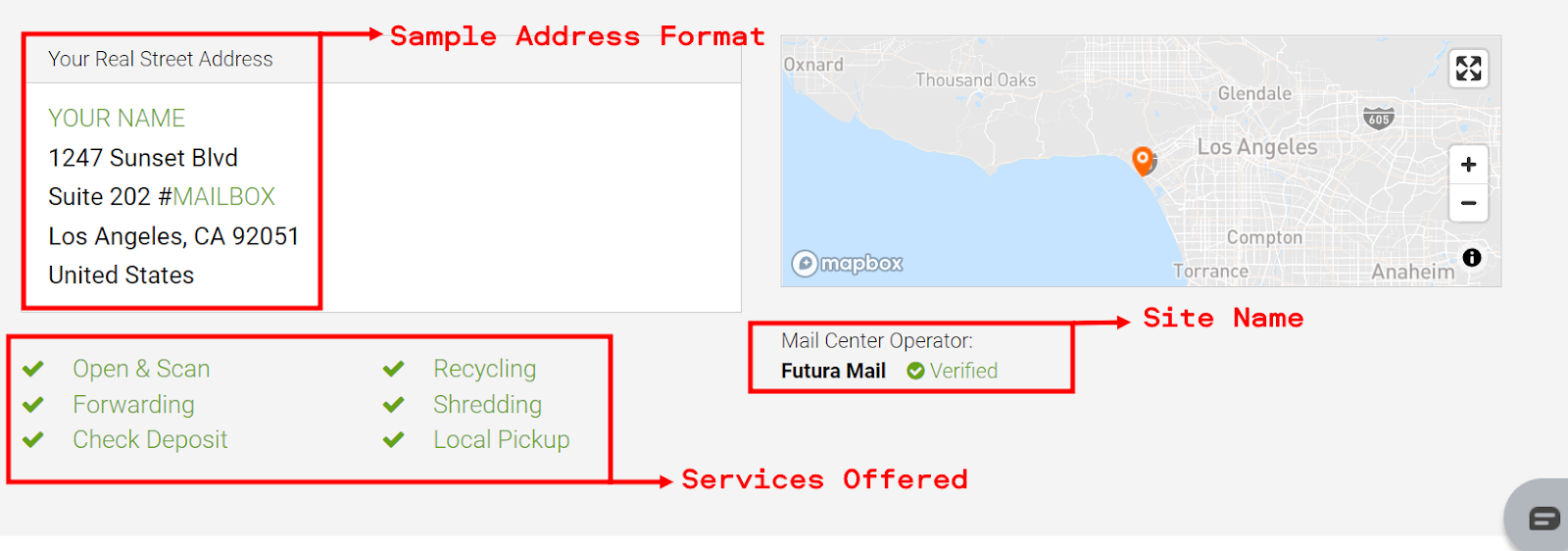 Step 2: Once you've chosen a location, the upper part of the page will show the sample address format for that mailing center, the services offered as well as the site name, which is the official name of the mailing center operator.