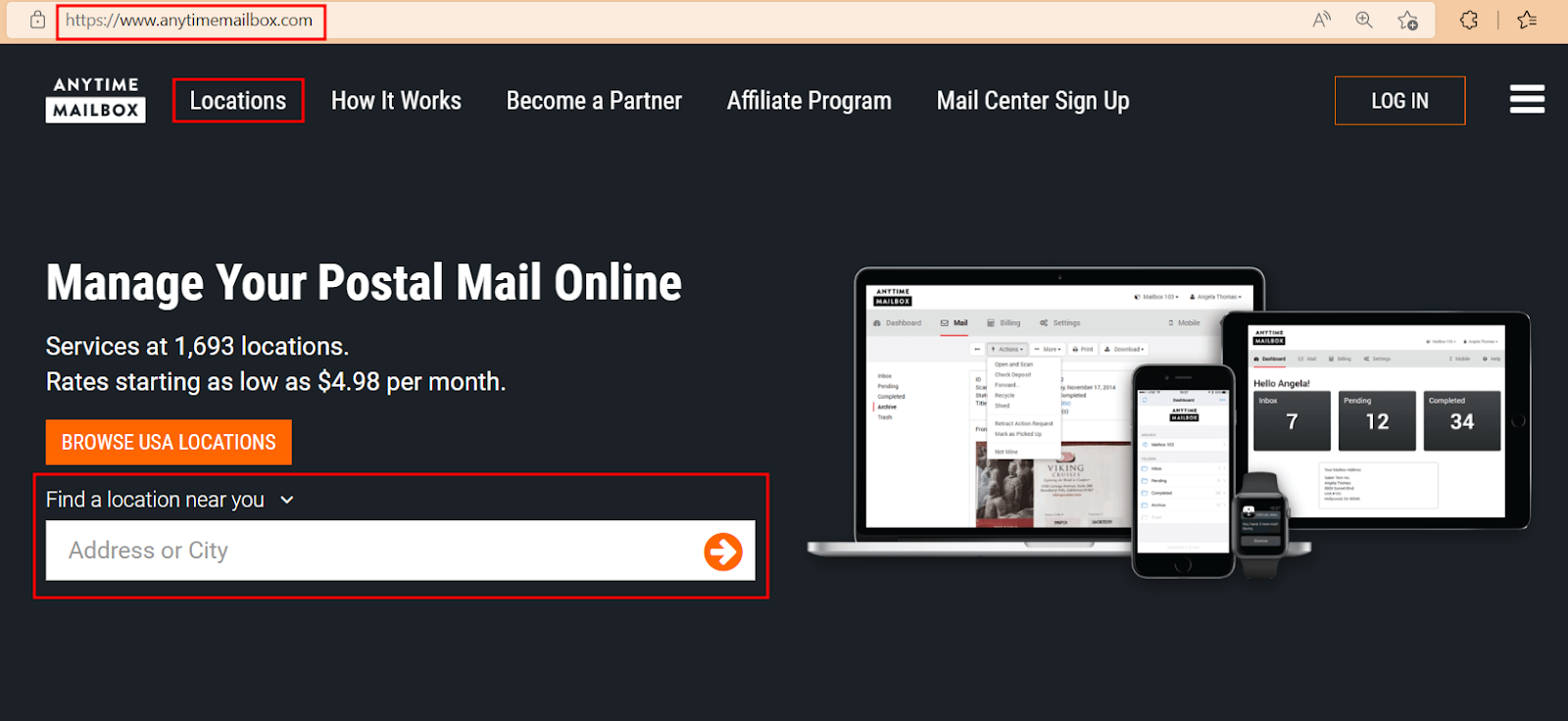 Step 1: Go to www.anytimemailbox.com and choose a location by clicking on Locations or using the Search Bar. You can enter the full street address, city, state, or zip code.