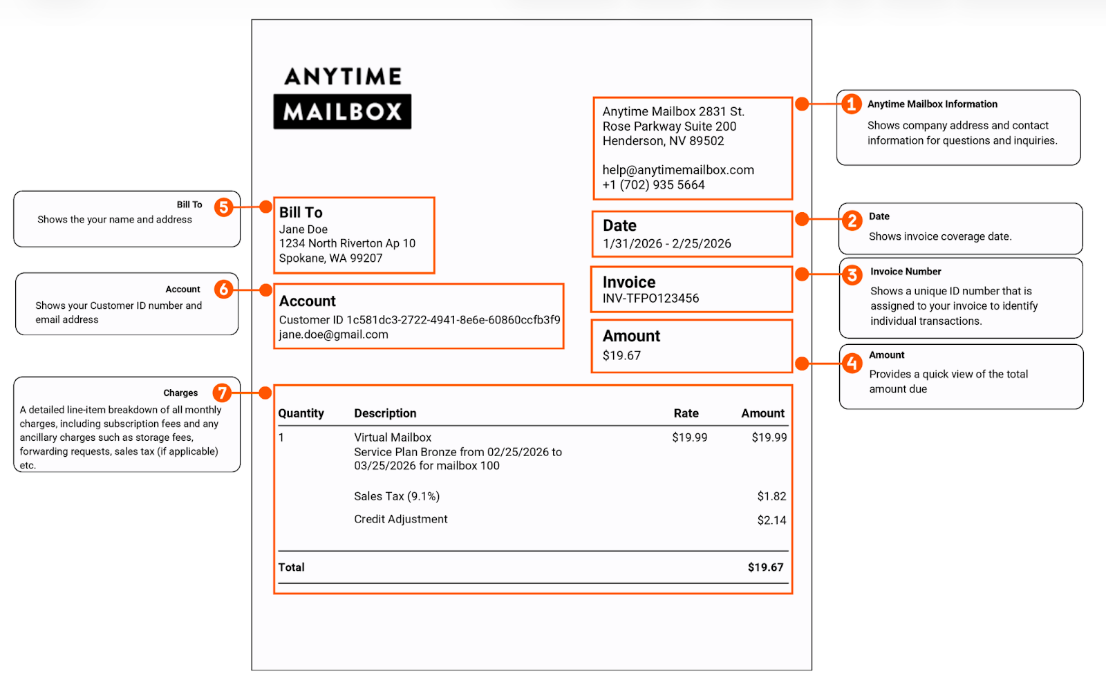 Your Monthly Invoice provides a detailed summary of all the charges you have incurred for your mailbox during a specific billing period.